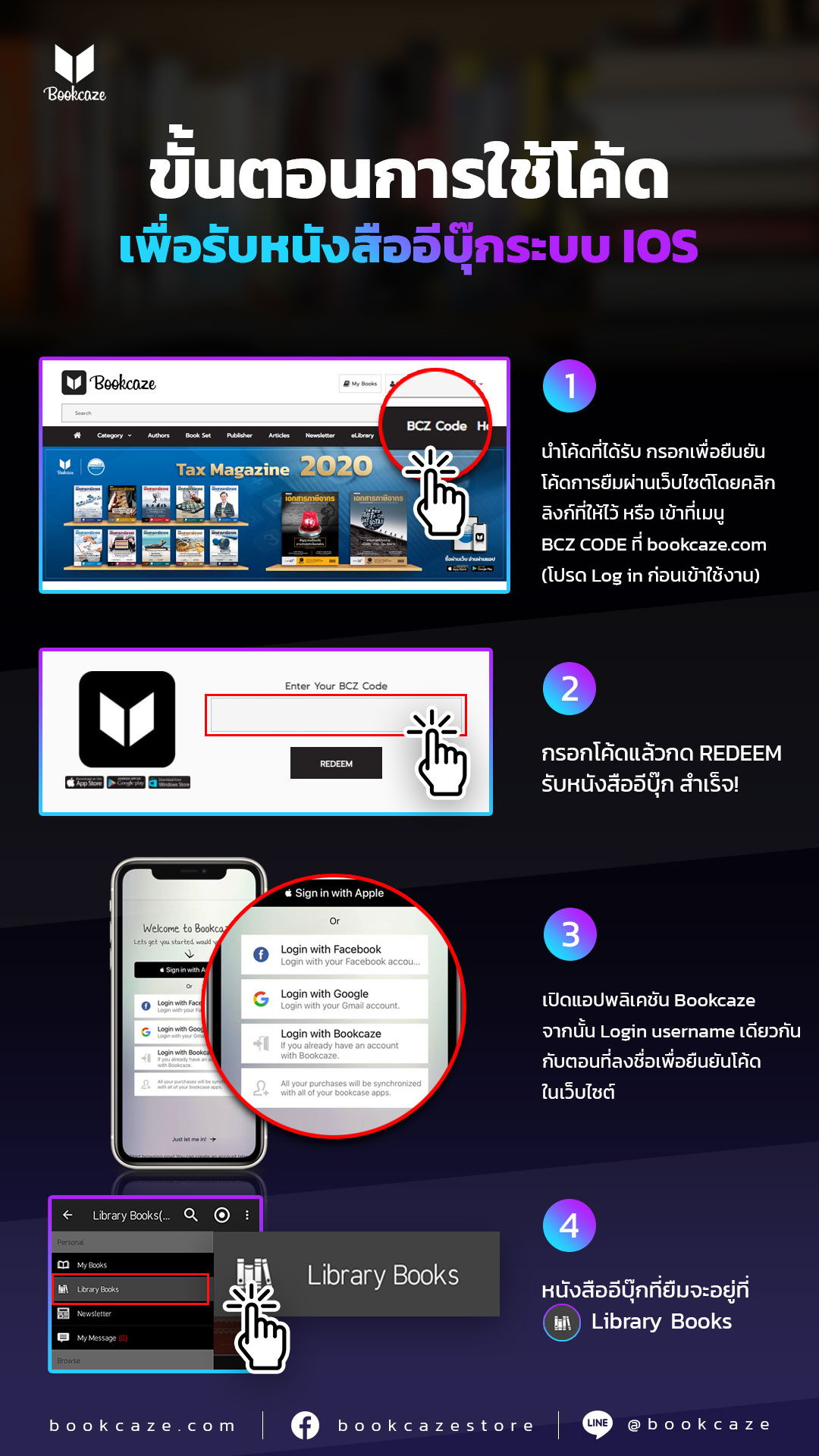 1.1 เข้าไปที่เว็บไซต์ https://www.bookcaze.com/index.php?route=bookgift/bookgift (หากยังไม่ได้เข้าระบบโปรดเข้าระบบโดยใช้อีเมลเดียวกับที่ใช้ขอยืมหนังสือ) จากนั้นกรอกรหัสที่ได้รับ และทำการกดยืนยันการใช้รหัส